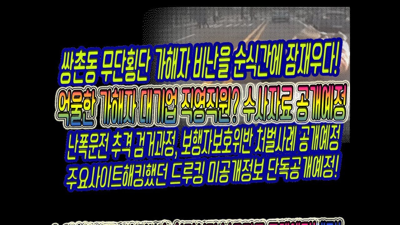 저도 법규를 준수하는 운전자편이지만 보행자들에 대한 욕설과 비난은 통보없이 삭제합니다. ㅡ 저런 사고의 가해자가될경우를 대비해서 궁금하신점들 올려주세요. 변호사님들이 무료상담으로는 안알려주는 내용도 속 시원하게 나홀로소송경험들을 바탕으로 알려드리겠습니다 \n\nㅡ 구간거리를 측정하시면 더 정확한 속도계산이 가능합니다. 30fps 원본에서 구간 프레임이 21f입니다. 0.7초정도 되죠. 15미터일땐 약 77킬로예상됩미다. 담당 수사관이 현장실측해서 과수대에 넘기면 한달이후에 결과가 나올듯하네요.. 운전자분도 속히 운보지원되기전이라도 변호사선임하시거나 발벗고 나서서야합니다. \n\n 스키드 마크가 남았을테니 차량중량등을 감안해서 계산될거구요. \n\n- 채널예고 ㅡ 단독공개! 뼈속깊이 민주당원이고 문재인대통령님과 민주당 지방선거 국회의원 캠프선거운동에도 참여했지만 현정부를 뒤흔들고도 남을 드루킹관련 중요 자료도 조만간 공개합니다. 부디 현정부의 척결되지 않은 적폐세력도 싹 몰아내고 다시금 새로운 각오로 재도약하기를 기원하는 맘으로 최초로 공개하겠습니다.\n\n\n00000\n본 사고처럼 무단횡단 사고시 운전자가 운보나 자보 특약의 법률지원 가입자여도 고생이 훤합니다. ㅜ\n\n검찰은 대법의 계속된 운전자 무혐의 판결때문에 패소의 가능성때문에 부담이 되지만 사망 사고라서 수사후 기계적으로 기소 전담하는 검사가 기소를 담당하게 됩니다. 기소전에 경찰과 검찰에서 조사받으러 오가느라 운전자는 멘붕상태이구요...\n\n운보나 특약에서 변호사지원이 되는데도 기소후 본인이 자포자기 상태이거나 그냥 벌금 지원 받고 말겠다고하거나 주변분들이 정신적으로라도 도와주지 않으면 그냥 법원출석도 안하고 공소장그대로 판결받아서 전과자가 되기도합니다. \n\n적극대응하고 변호사선임해서 무혐의 판결로 억울함을 씻기를 기원합니다. 도의적으로나마 책보한도로 치료비 장레비 지급에 합의하시는 방법도 있구요. \n\n문제는 정식기소시 법원판결이 빨라도 6개월에서 늦으면 1년이상도 걸리므로 형사합의도 봐야하는 경우이죠... 운보나 특약에서 지원되면 문제는 없지만 합의 과정에서 멱살잡히고 폭행당하기도 합니다. ㅜㅜ\n\n운보나 특약 미가입이셔도 정식기소시 국선변호사선임가능하구요 고액자산가나 연봉자가 아니라면 법률구조공단의 소송구조신청도 가능합니다. 예전과 달리 국선변호인님들도 적극 변론에 임하십니다. 관할경찰청 과학수사대나 국과수 속도분석결과도 중요한 증거자료가 될거구요.. 무엇보다 본 블박영상과 향후 확보할 시시티비도 보행자의 갑작스러운 무단횡단 입증에 결정적 증거가될것으로 보입니다.\n\n0000000000\n운전자가 기소후 무혐의로 승소시 보행자와 유족들 풍파에시달리게됩니다.. 제발 무단횡단하지마세요 ㅜ. ㅜ\n저와 협회분들이 보행자보호위밤차는 꼭 신고해서 7만원 과태료 받게하고있지만 저런 무단횡단은 대책이 없습니다ㅜ.ㅜ 양쪽 당사자에게 큰 충격과 손해를 앉겨주죠.\n\nㅇㅇㅇㅇㅇㅇㄹㄹㅇ\n 각종 사고의 과실다툼의 중요한 근거가 되는것이 바로 속도분석입니다. 블랙박스의 gps 상의 속도는 오차때문에 참고자료는 가능하나 결정적인 증거로는 법정에서나 겨우 인정되는편입니다. \n\n간혹 경찰수사단계에서 이를 지피에스속도를 근거로 당사자를 압박하고 겁을 주기도하지만 기만하는 행위입니다. 거의 일치하기도 하지만 오차를 감안해야하거든요. \n\n그래서 국과수나 교통공단에서 현장 제동거리나 영상에서 나오는 주행거리를 실측해서 분석하는것이 법정증거가 되기도하지만 제가 분석해드린 부산비접촉 사고 사례처럼 거의 두달가까이 걸리기도합니다. \n\n\n각종 논란중인 법규사항에 대한 실제 신고와 처벌사례 및 직접 찍거나 제보받은 영상으로 찾아뵙겠습니다. \n\nhttp://cafe.naver.com/ts4u 번호판판독/블랙박스분석 속도산출/교통사고보상제대로받기/교통위반신고/나홀로소송/ 검경조사절차대응요령 무료상담해드립니다. townnews777@gmail.com